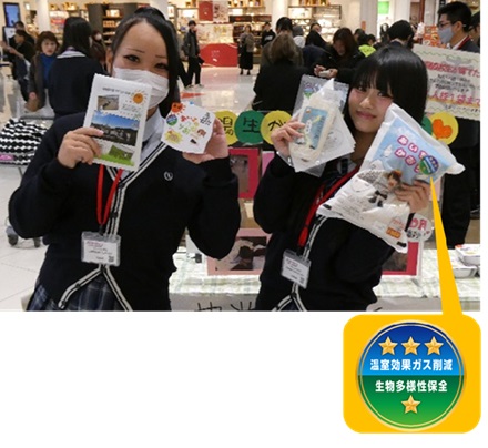 本フェスタでは、南陽高校が、昨年から取り組んでいる農産物の環境負荷低減を、星の数で表した「みえるらべる(注)」を表示した米、パックご飯、米粉麺などを販売しました。用意した米は、訪れた方から「みえるらべるを初めて知った」「環境に配慮して育てたお米を食べるのが楽しみ」という声とともに、両日とも完売しました。