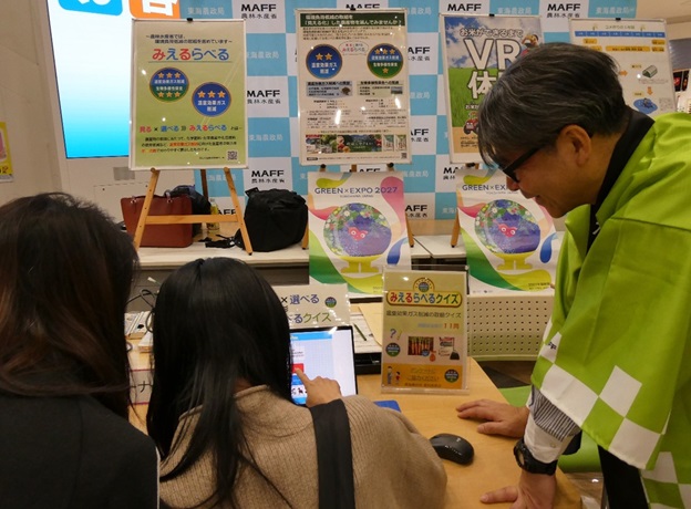 当拠点は、「見える化」のクイズに加えて、消費者向けの「持続可能な食料システム」クイズを実施し、日本の農業の現状と課題をはじめ、食品ロス削減、環境にやさしい農産物の選択など、消費者が自ら取り組めることについて啓発しました。クイズに参加した親子からは、「娘と一緒にクイズができて、とても楽しく勉強できました!」といった好意的な声をいただきました。また、農業に触れる機会の少ない子ども向けに「お米ができるまで」のVR体験を実施しました。「わー、広い~!きれいな田んぼの景色が見えるよ~」、「お米が実って出荷する様子を見ることができて、育てる大変さが伝わってきました」との声も聞かれました。