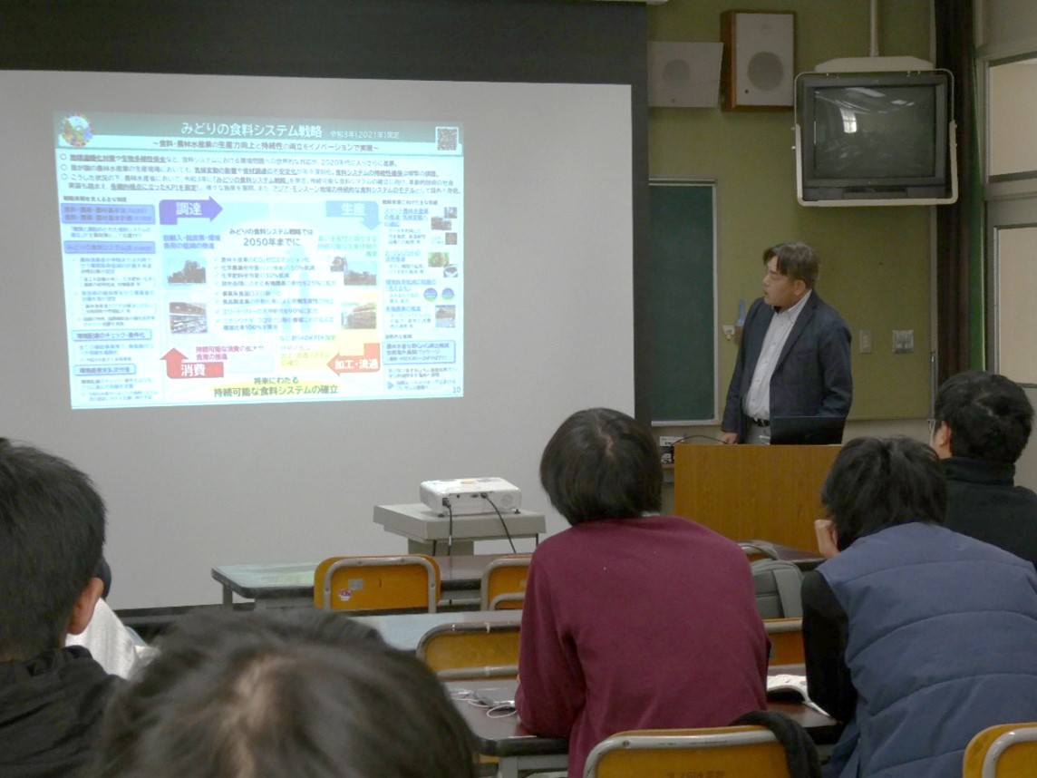 三重県拠点は、三重県農業大学校(三重県松阪市)からの依頼を受け、2月2日、同校の専門必修科目「環境保全と農業」の一環として、中川地方参事官が「みどりの食料システム戦略」について講義を行いました。