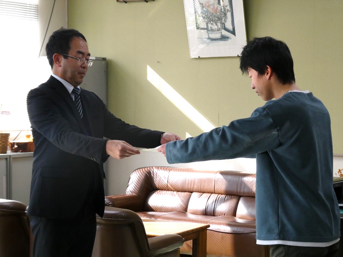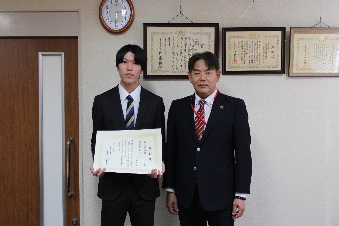 表彰状を授与された鳥羽商船高等専門学校の学生(右:中川地方参事官)(2月4日撮影)