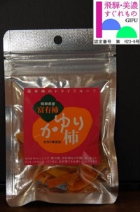 かゆり柿50g 岐阜県産富有柿を独自製法で仕上げた、風味豊かな柿ドライフルーツ。「飛騨・美濃すぐれもの」認定。 |